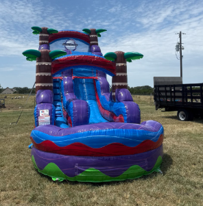 Bring the beach vibes straight to your backyard with the 18ft Tropical Hurricane Water Slide! Towering at 18 feet high, this inflatable water slide rental is packed with adrenaline-pumping fun. Kids, teens, and even adults can climb up, race down, and splash into the refreshing pool at the bottom. With its palm tree design and vibrant tropical theme, it’s the perfect centerpiece for summer birthdays, school events, church festivals, and community gatherings.